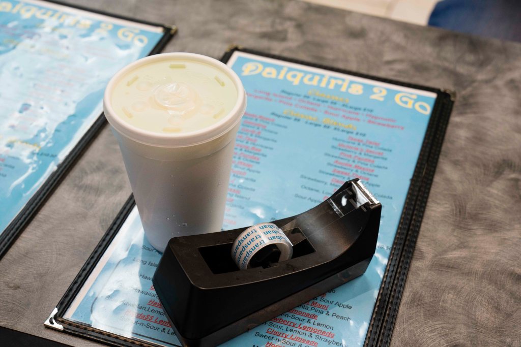 We learned another fascinating tidbit about Texas. Apparently, in Texas, you can get an alcoholic daiquiri from the drive thru of Daiquiris To Go. The sealed container law permits it, as long as there is scotch tape over the hole for the straw. Yep. Here’s a picture of one that our friend bought (from the store front) so she could see it for herself. Hilarious.