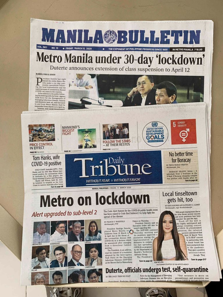 Breakfast, which turned out to be a great value with lots of variety, was included with our hotel. On March 13, as we went down to breakfast, we noticed Manila newspapers in the lobby with headlines shouting “Manila on Lockdown”. Uh oh. We read the news and saw that Metro Manila, where we were, would be on lockdown, with no travel in or out, for 30 days beginning March 15 (actually 31 days, from the beginning of the day on March 15 to the end of the day, presumably, on April 14). We were semi lucky because we already had ferry tickets leaving for Coron island the evening of March 13. Not a big deal yet. Since Manila was going to be closed, we could fly from Coron to Cebu to get out of the country and then link up with our next round-the-world trip ticket flight from Singapore to Vienna on April 14. Keep in mind that we MUST make it onto that flight and ALL of our round-the-world ticket flights or the airline would cancel the rest of the tickets (or so we were told by the Singapore Airlines call center representative). So in order to keep our trip alive, we could not get locked down in Manila for 30 days; such a delay would cause us to miss the flight from Singapore and effectively cancel the rest of our trip.