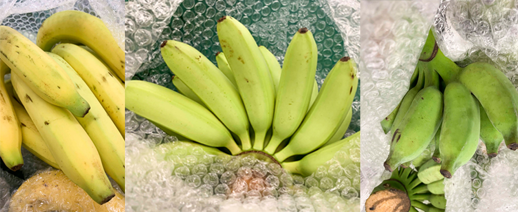 Some banana types from left to right: Cavendish, Egg, Namwaa